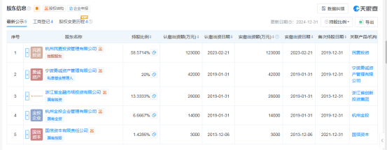 目前民营企业杭州民置投资管理有限公司(下称“民置投资”)上升为第一大股东。天眼查显示,截至2024年12月31日的信息,民置投资持股比例为58.57%,宁波勇诚资产管理有限公司持股比例为20%,浙江省金融市场投资有限公司持股比例为13.33%、杭州金投企业管理有限公司持股比例为6.67%,国信资本有限责任公司持股比例为1.43%。除了民置投资外,余下4家股东均为国资控股企业。