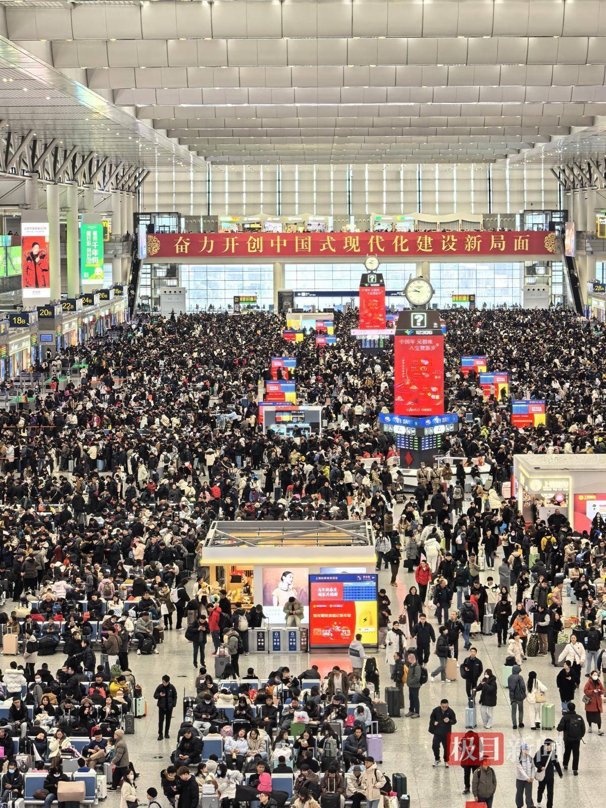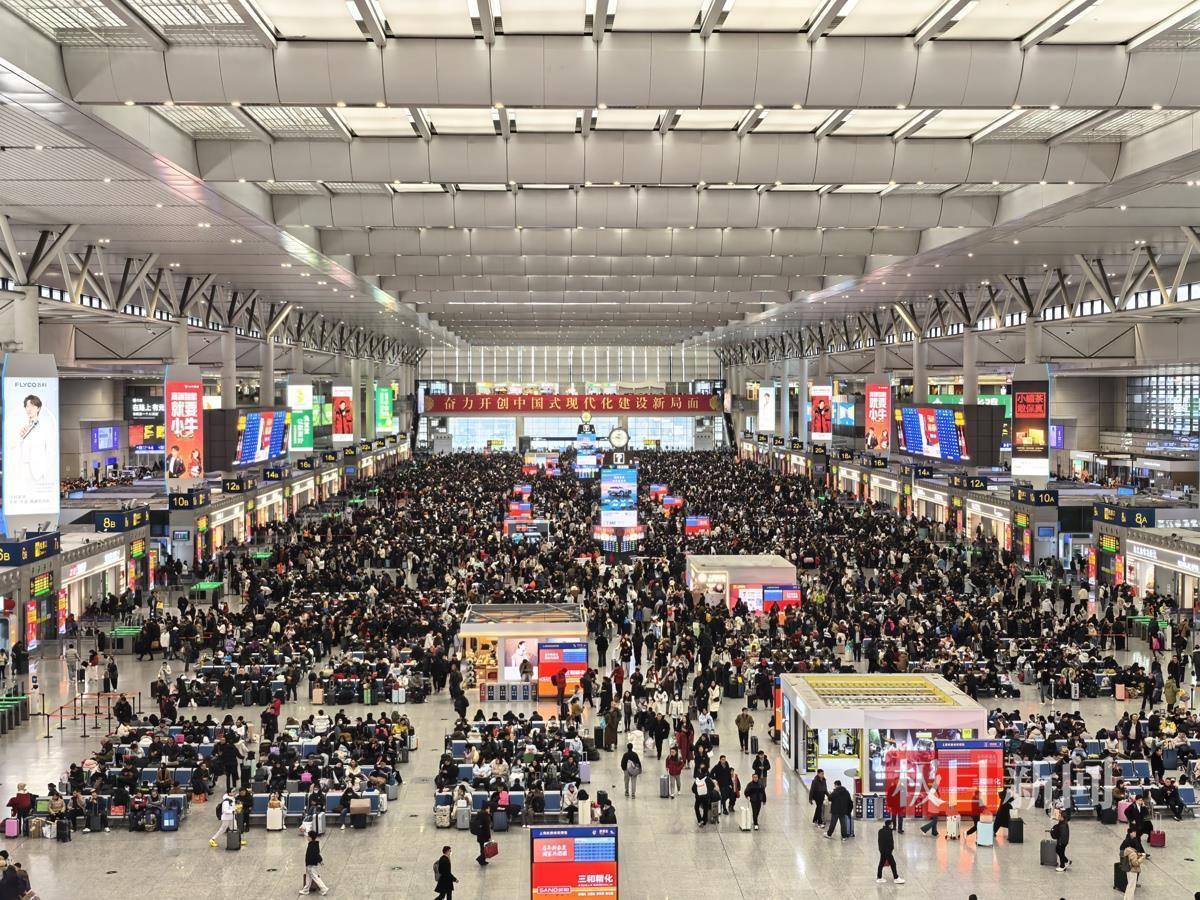 2月10日(腊月二十三北方小年),2026年春运进入第9天。当天上午10时左右,极目新闻记者在上海虹桥站内看到,大量旅客已抵达车站候车室,候车区域几乎没有空座。